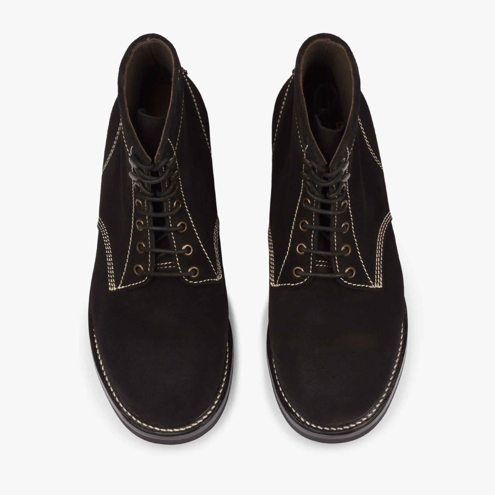 These black suede leather boots combine classic style with durable craftsmanship. Featuring a round toe and secure lace-up design, they offer both comfort and a tailored fit. Ideal for adding a refined touch to your wardrobe, these boots provide reliable support and timeless appeal for everyday wear.