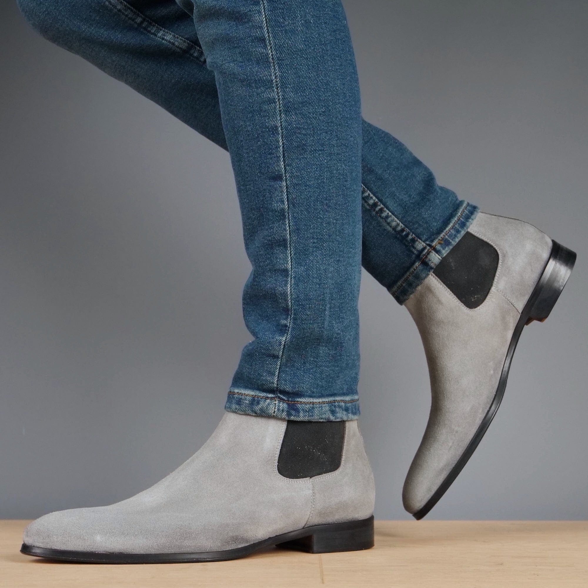 Crafted from premium suede leather, these grey Chelsea boots offer effortless slip-on convenience with elastic side panels. The classic silhouette features a pull tab for easy wear, while the durable construction ensures lasting comfort and stability. Perfect for elevating both casual and semi-formal attire with sophisticated versatility.